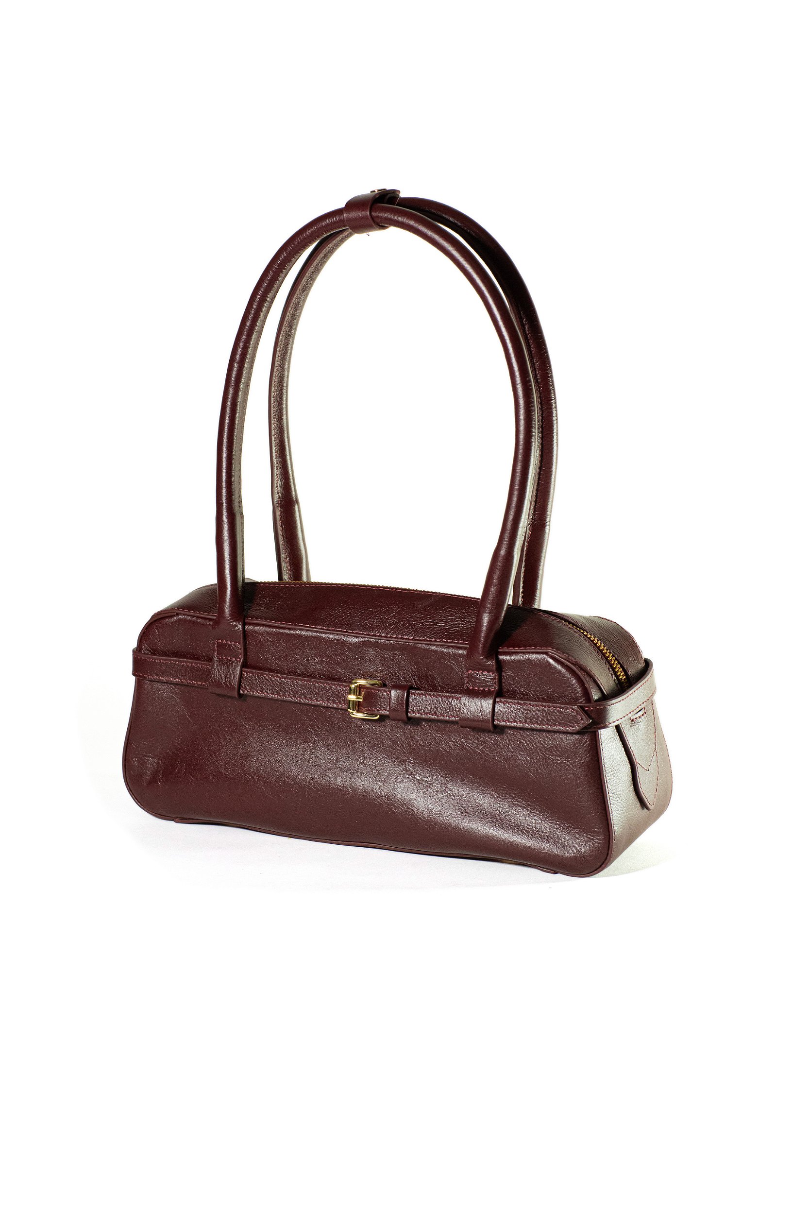 Possui duas alças médias, também em couro da mesma cor, permitindo uso confortável no ombro. Na parte frontal, há uma faixa decorativa com uma pequena fivela metálica dourada, que adiciona um toque refinado ao design. O zíper superior é discreto e acompanha toda a extensão da bolsa, garantindo boa abertura e praticidade.