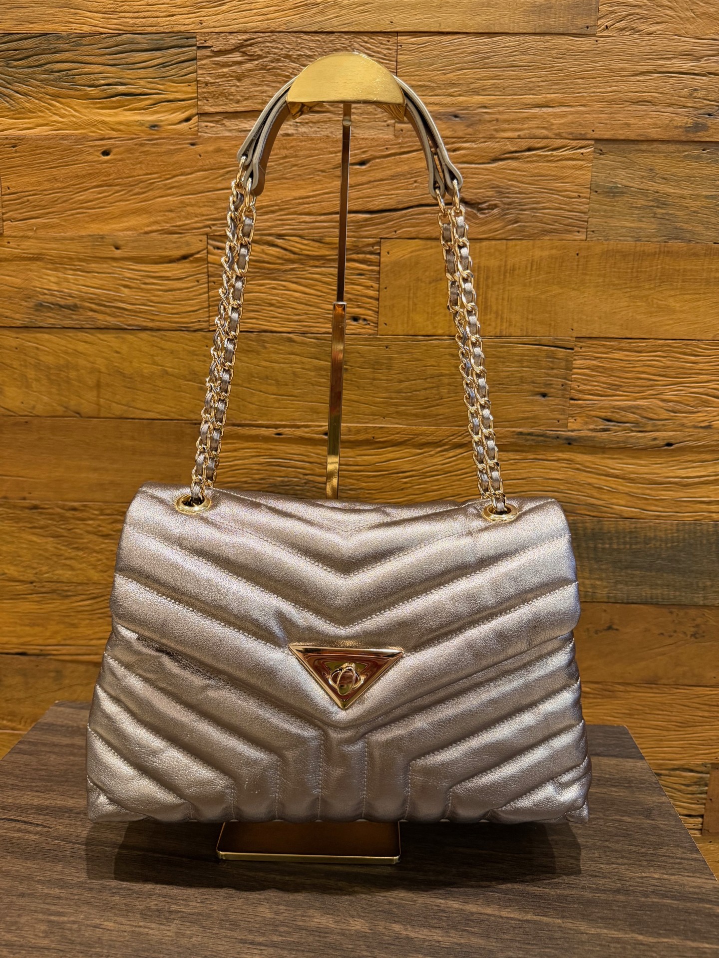 Seu design clássico de luxo, combinando elegância com um toque contemporâneo. Na parte frontal, há um triângulo metálico dourado com detalhe central também dourado, funcionando como elemento decorativo marcante e reforçando o visual glamouroso da peça.