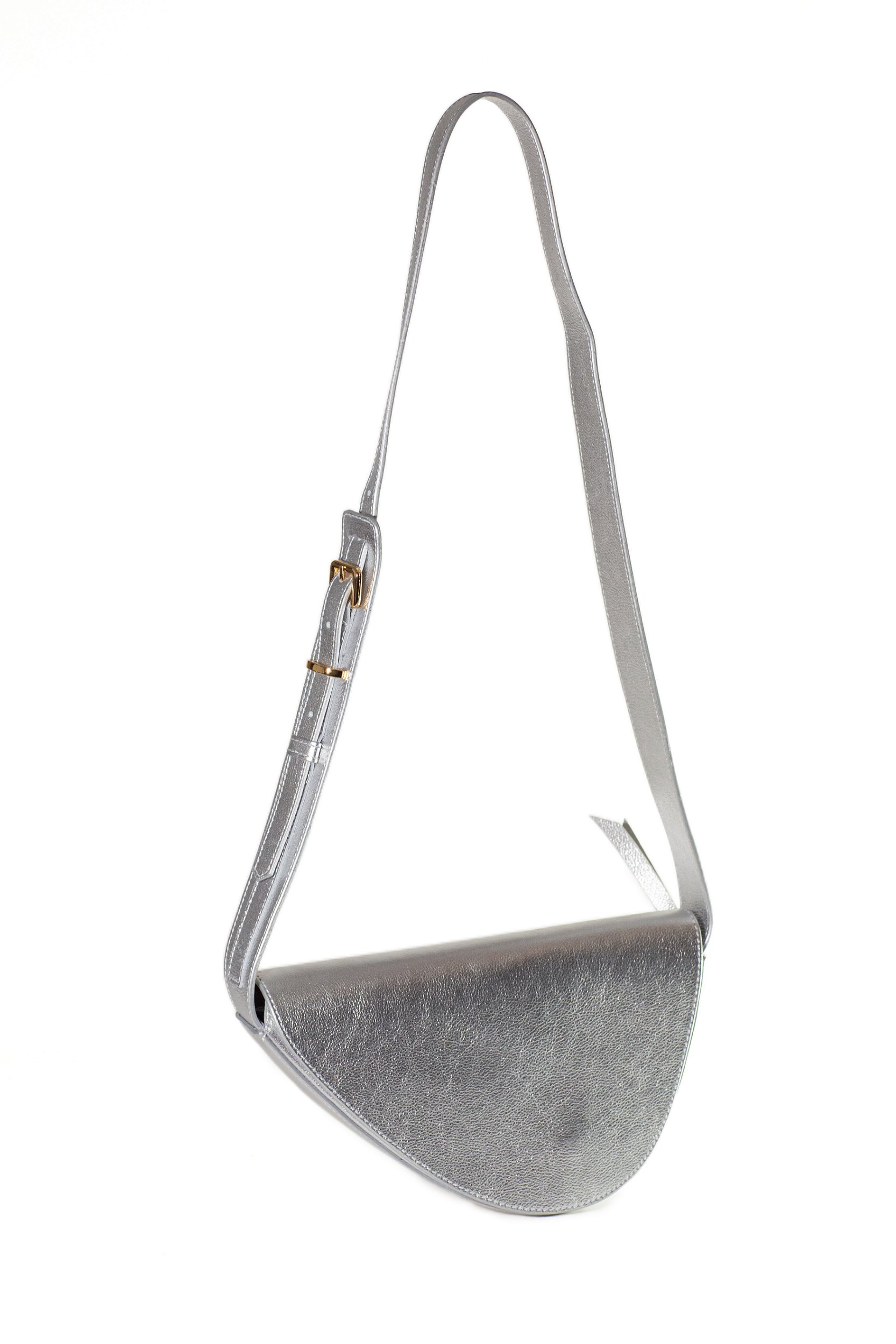 É uma peça de design elegante e minimalista, feita em couro metalizado prata de aparência lisa e sofisticada. Seu formato é semicircular, com linhas limpas e bem definidas, transmitindo um estilo moderno e ao mesmo tempo clássico.